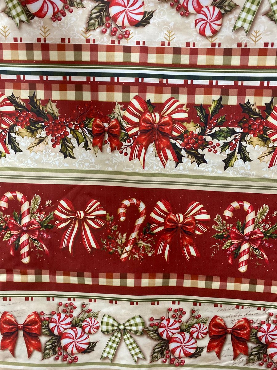 As barras decoradas com motivos natalinos — como pinheiros, estrelas, laços, renas e guirlandas — tornam este tecido ideal para toalhas de mesa, aventais, panos de prato, caminhos de mesa, saquinhos e artesanato em geral.