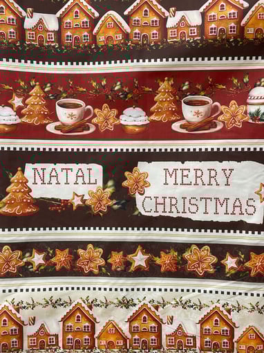 As barras decoradas com motivos natalinos — como pinheiros, estrelas, laços, renas e guirlandas — tornam este tecido ideal para toalhas de mesa, aventais, panos de prato, caminhos de mesa, saquinhos e artesanato em geral.