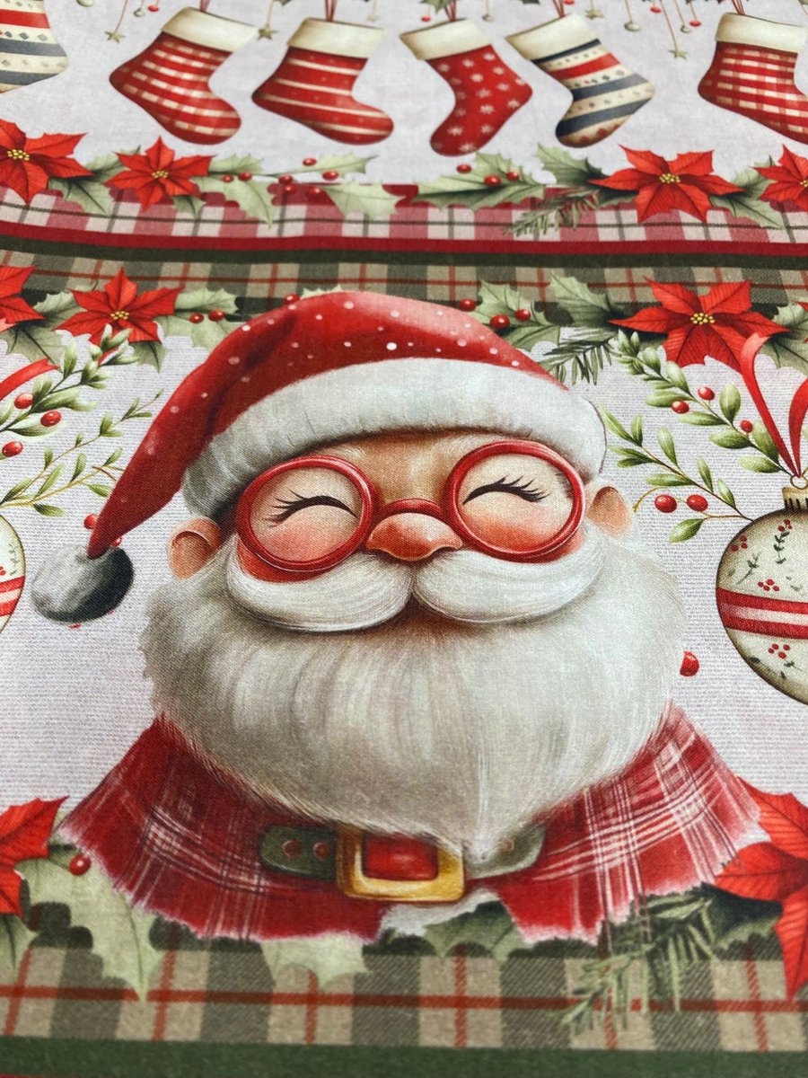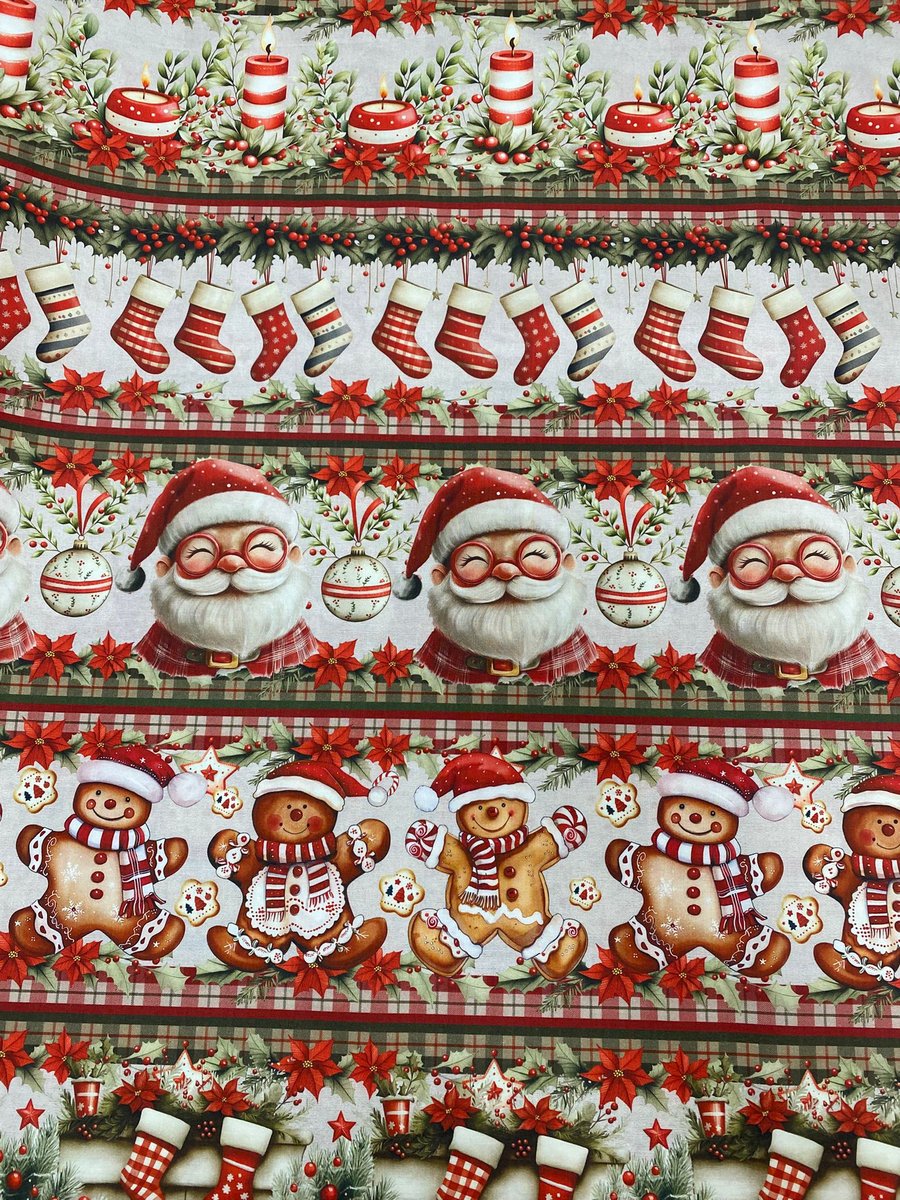 As barras decoradas com motivos natalinos — como pinheiros, estrelas, laços, renas e guirlandas — tornam este tecido ideal para toalhas de mesa, aventais, panos de prato, caminhos de mesa, saquinhos e artesanato em geral.