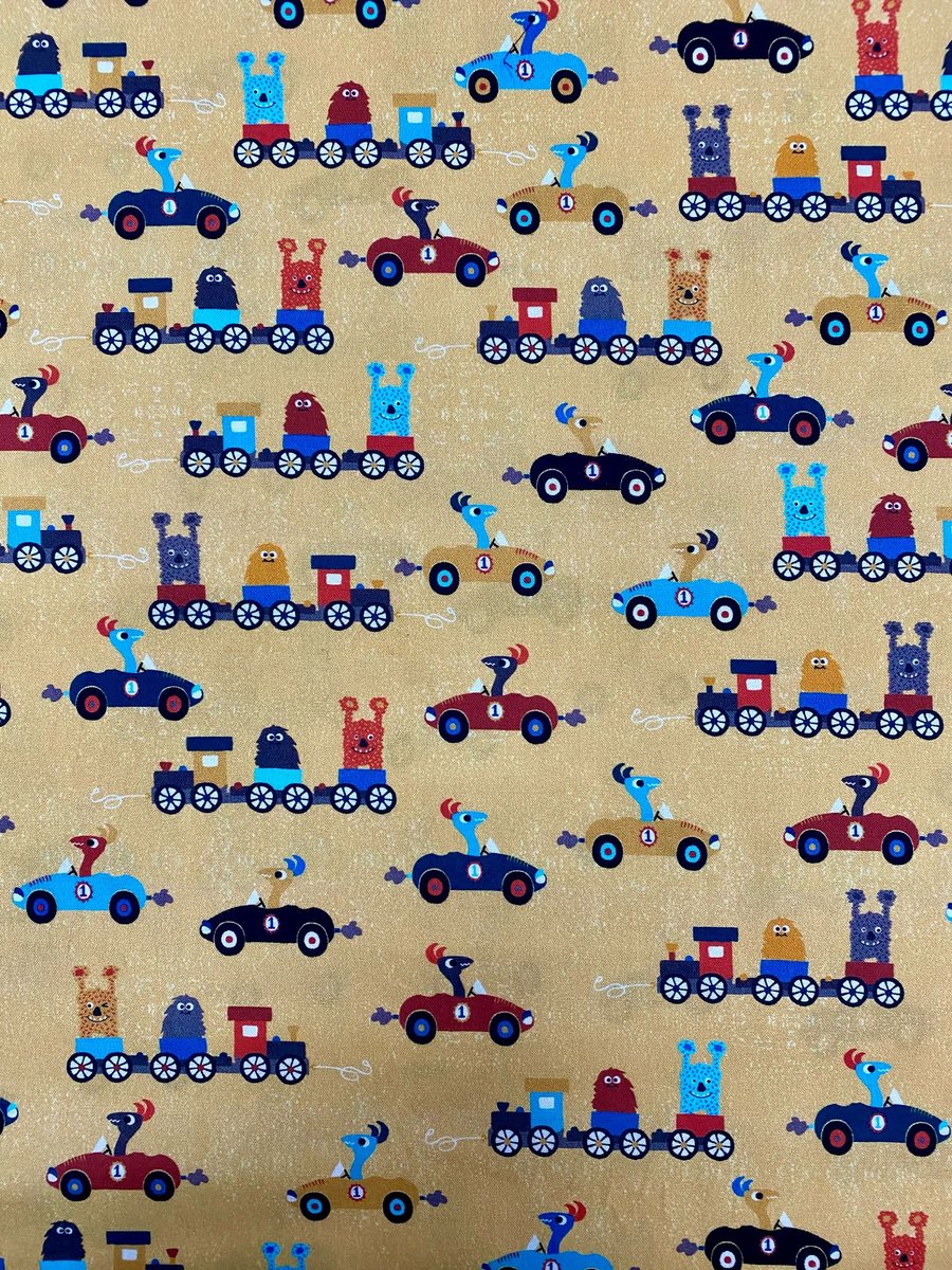 Estampa de Carrinhos com monstros, fundo amarelo.