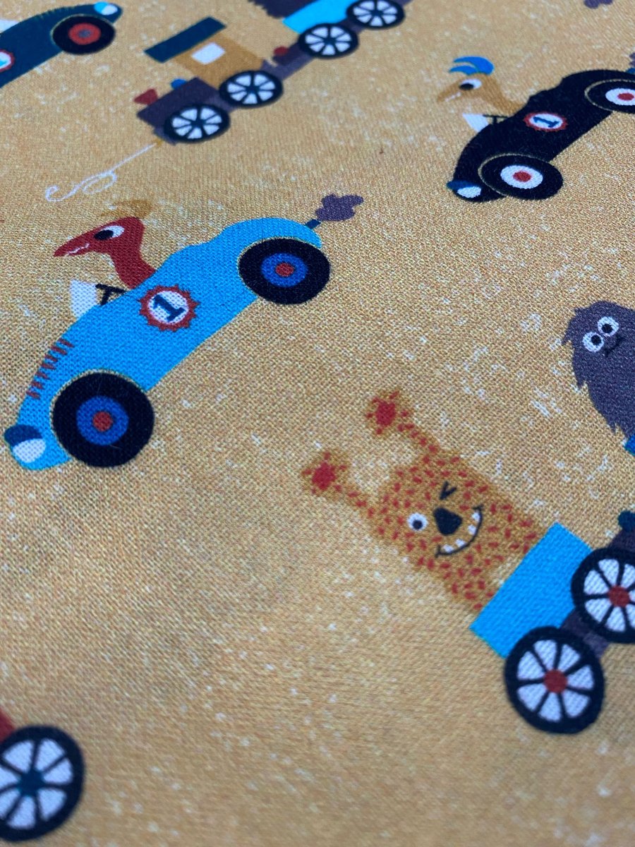 Estampa de Carrinhos com monstros, fundo amarelo.