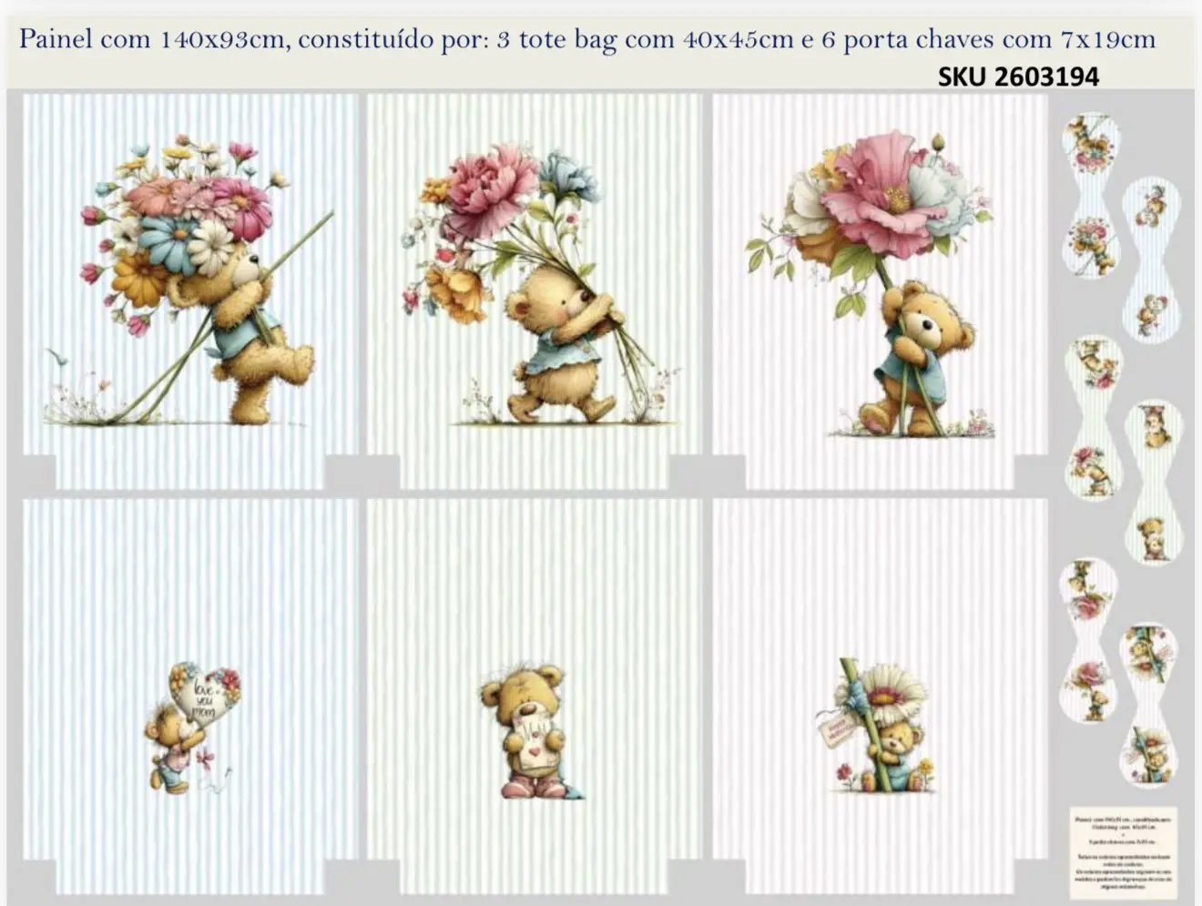 Painel com 140x93cm, constituído por: 3 tote bag com 40x45cm e 6 porta chaves com 7x19cm
