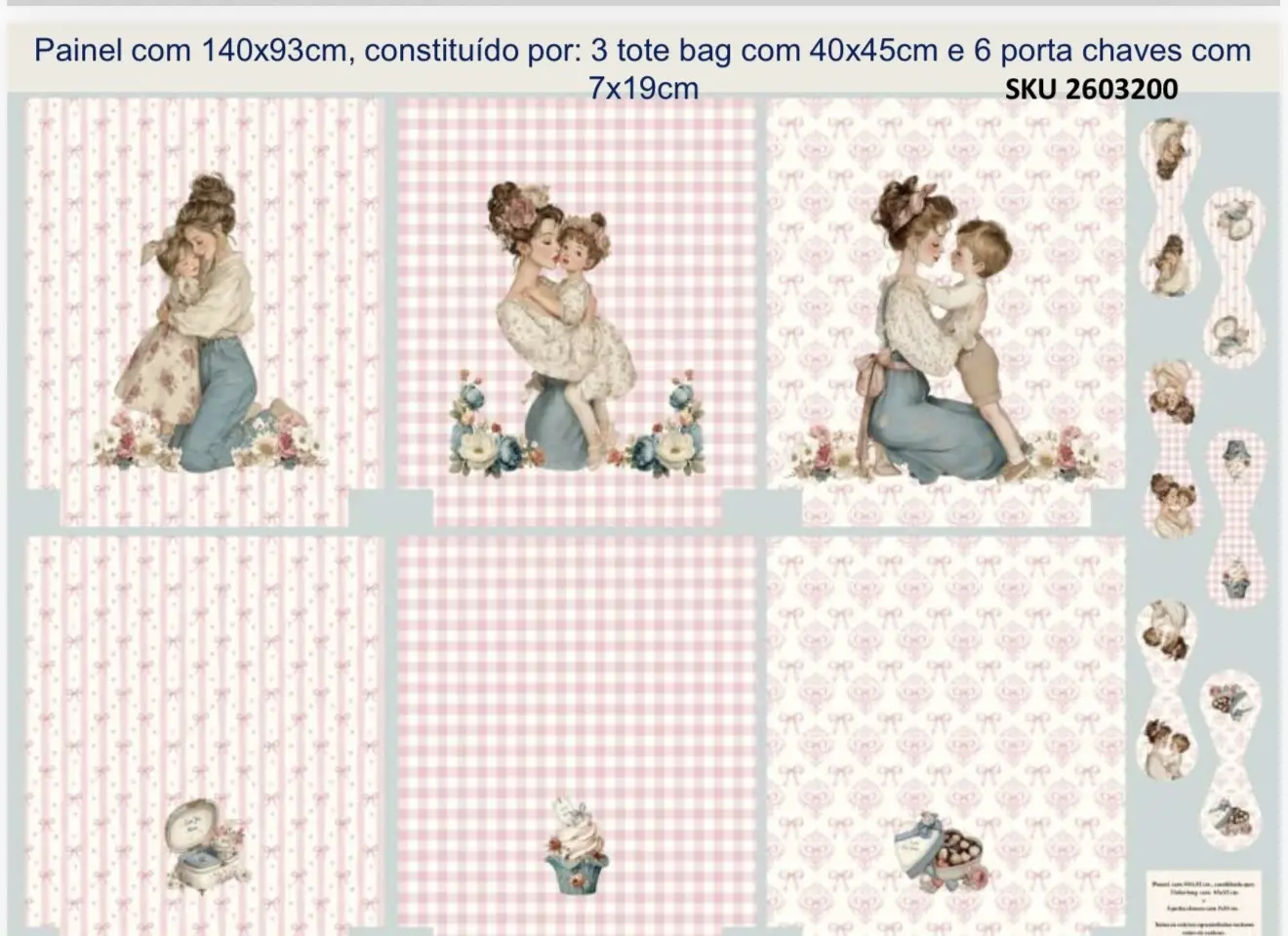 Painel com 140x93cm, constituído por: 3 tote bag com 40x45cm e 6 porta chaves com