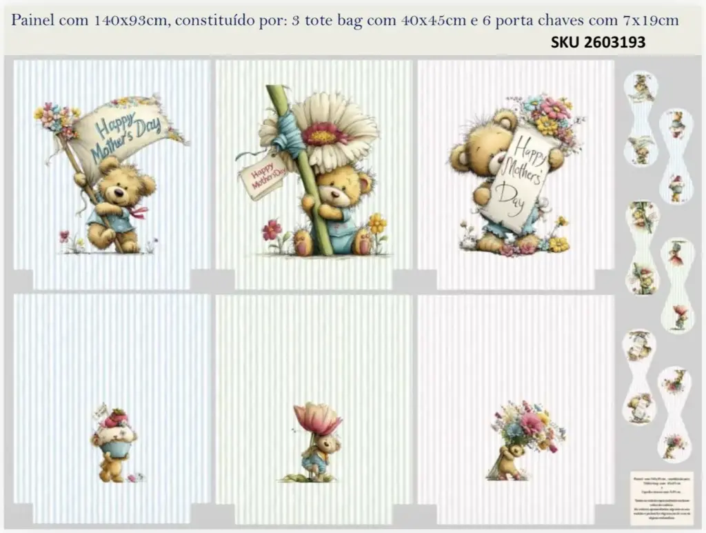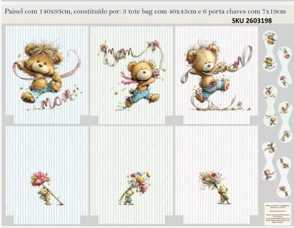 Painel com 140x93cm, constituído por: 3 tote bag com 40x45cm e 6 porta chaves com 7x19cm
