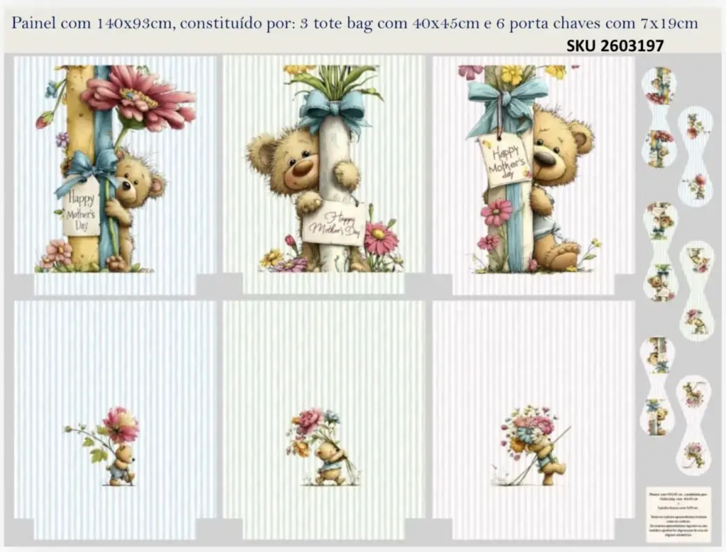 Painel com 140x93cm, constituído por: 3 tote bag com 40x45cm e 6 porta chaves com 7x19cm