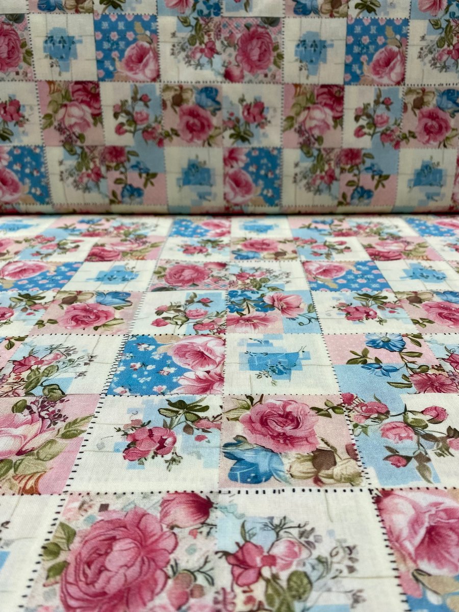 Este lindo tecido combina o charme do estilo patchwork com estampas florais delicadas, em tons suaves que trazem um toque vintage e romântico. Ideal para projetos criativos como colchas, almofadas, mantas, toalhas de mesa e artesanatos em geral.