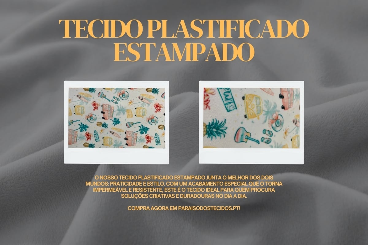O nosso Tecido Plastificado Estampado junta o melhor dos dois mundos: praticidade e estilo. Com um acabamento especial que o torna impermeável e resistente, este é o tecido ideal para quem procura soluções criativas e duradouras no dia a dia.